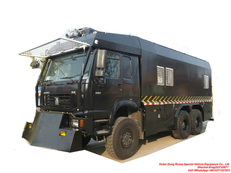 1. Water cannon: The roof is equipped with 2 DC electric control anti-riot main water cannons, which can be used for long-distance flooding. An auxiliary water cannon is mounted in front of the vehicle to strike against the riot target in front of the vehicle.